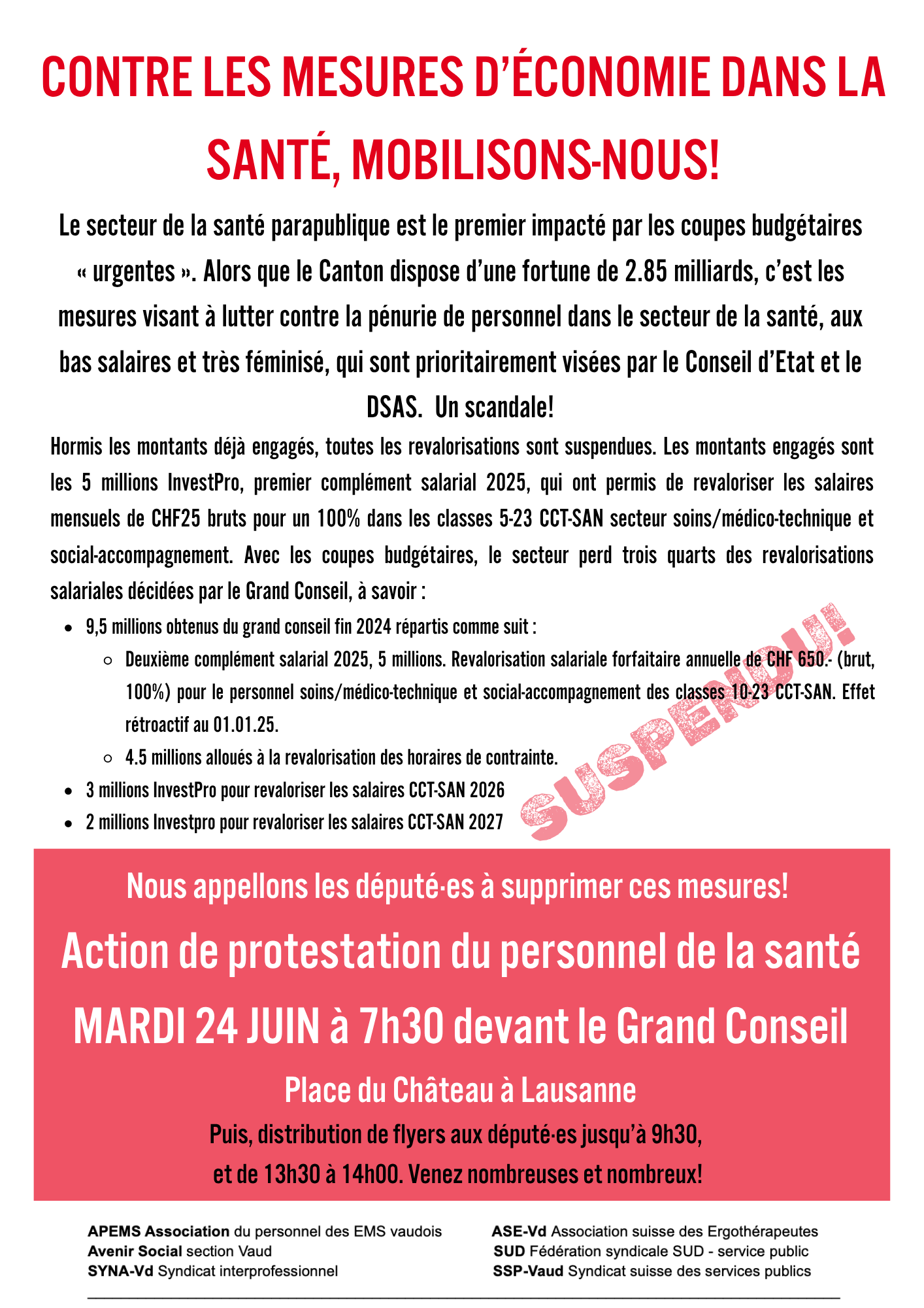 Pour éponger le déficit des comptes 2024 du Canton de Vaud, le Conseil d’État et le Département de la santé et de l’action social (DSAS) ont décidé de suspendre toute nouvelle décision d’engagement financier. Cette décision a pour conséquence directe le gel du versement des 9,5 millions complémentaires destinés aux revalorisations salariales de la CCT SAN et à la lutte contre la pénibilité du travail adoptés par le Grand Conseil en décembre 2024.