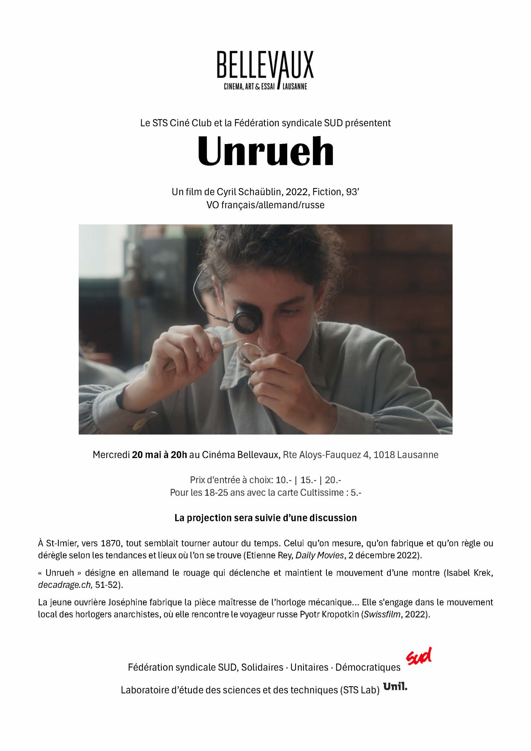 En partenariat avec le Laboratoire d’étude des sciences et des techniques (STS Lab) de l’UNIL, SUD a le plaisir de vous inviter à regarder ensemble Unrueh, un film de Cyril Schäublin (2022). La projection sera suivie d’un moment d’échange et de discussion.